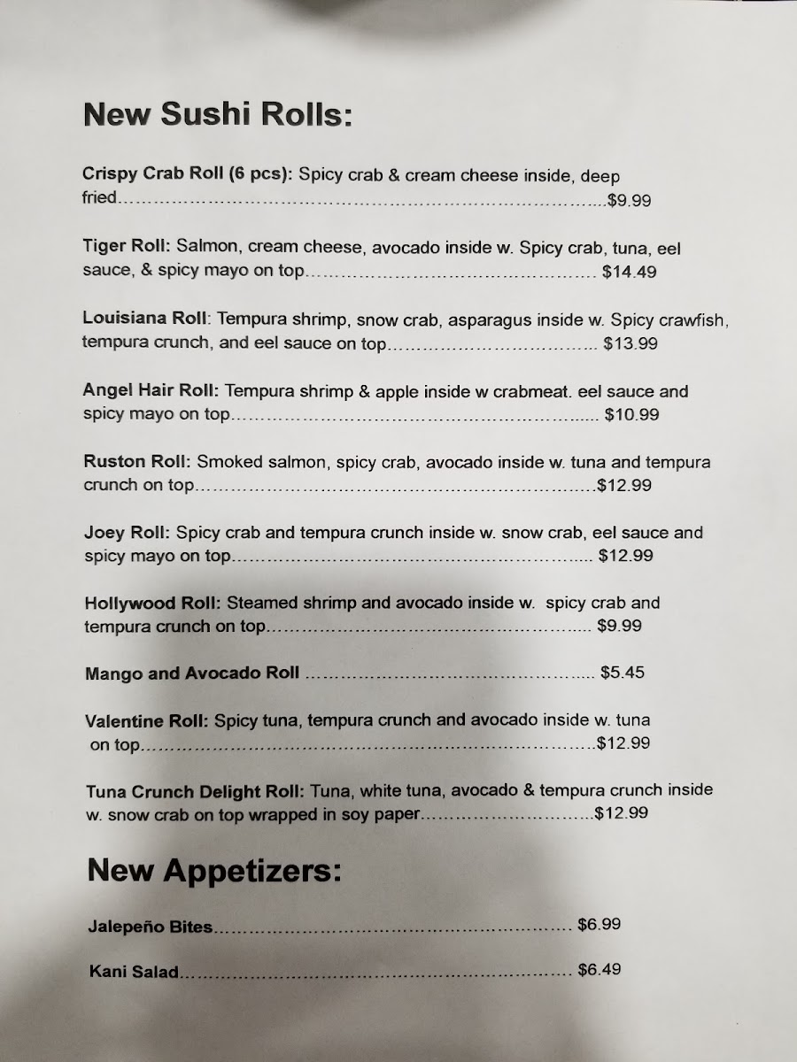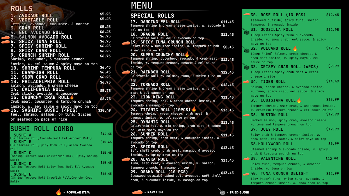 Shrimp tempura roll, crawfish roll, crunchy crab roll.