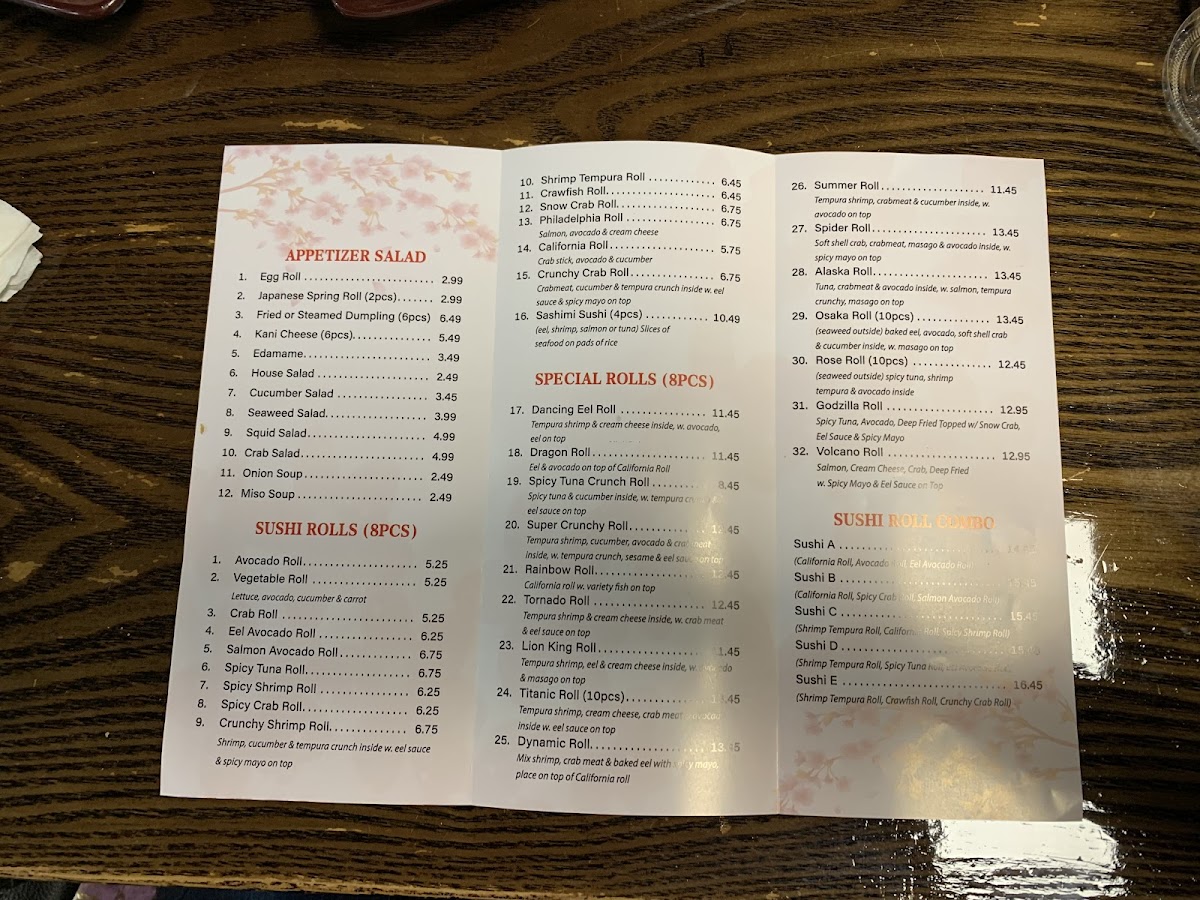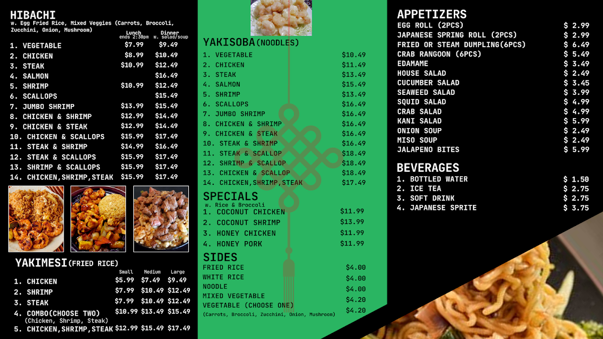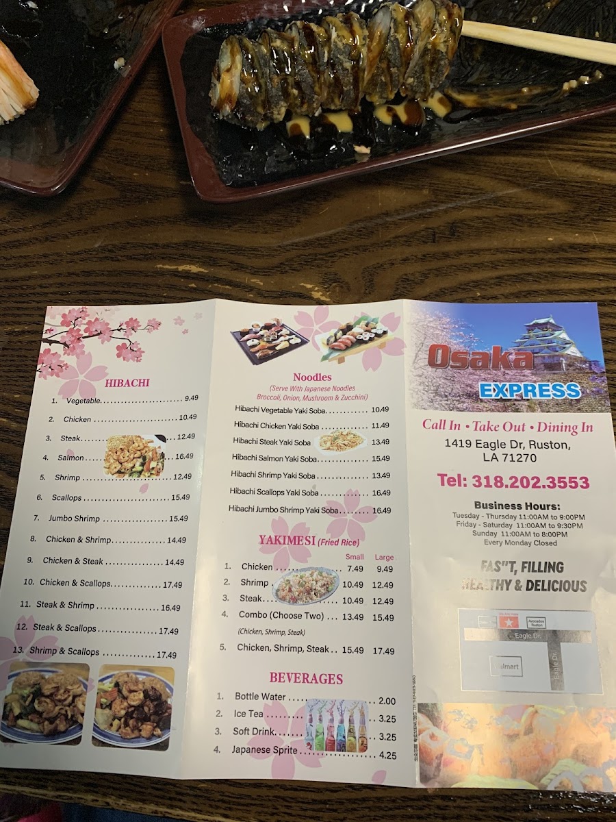 The menu at Osaka Express offers a delightful variety of dishes, ranging from flavorful hibachi and yakisoba options to sushi rolls and unique specials. For noodle lovers, the Hibachi Yakisoba selection includes choices like Hibachi Shrimp & Scallop Yakisoba and Hibachi Vegetable Yakisoba. The fried rice options, or Yakimesi, come in combinations such as Chicken & Shrimp Yakimesi and Shrimp & Steak Yakimesi. The specials stand out with mouthwatering choices like Honey Chicken and Coconut Shrimp. Sushi enthusiasts will enjoy rolls like the Philadelphia Roll, Crawfish Roll, and the spicy Spicy Crab Roll, along with combos like Sushi C and Sushi D. Appetizers like Kani Salad and Japanese Spring Roll start off the meal with fresh flavors. The hibachi section offers both dinner and lunch options, such as the Hibachi Shrimp and Hibachi Chicken & Scallops. For a more indulgent experience, the Osaka Roll and Volcano Roll are standout special rolls. Completing the meal are beverages like Japanese Sprite and Ice Tea, providing a refreshing end to a satisfying dining experience.